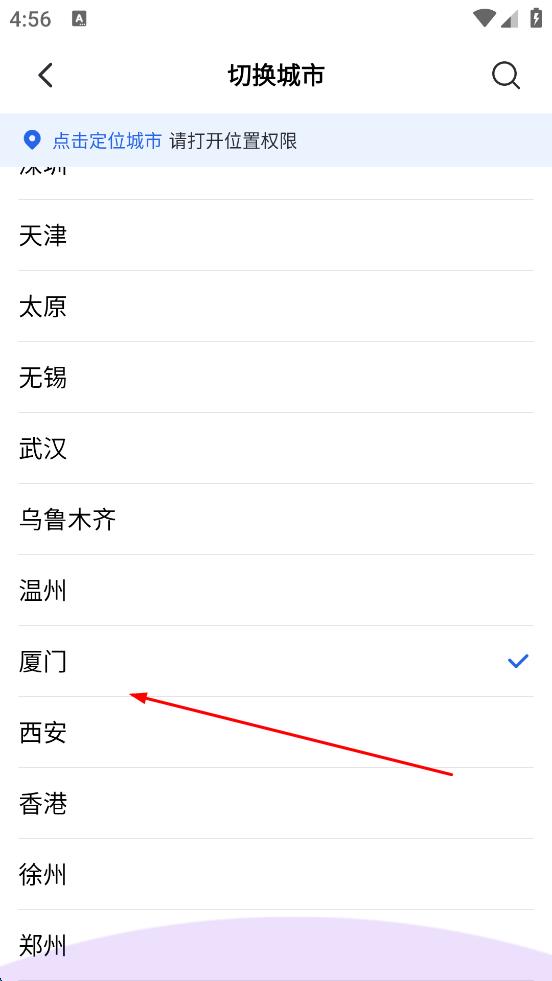 2、在切換城市頁面,瀏覽城市列表,找到想要切換的城市,比如“廈門”,點擊該城市,完成城市切換操作。