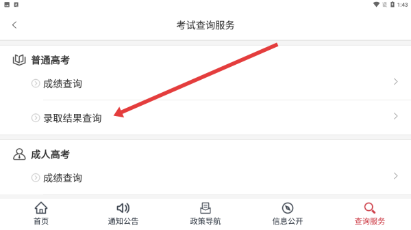2、在考試查詢服務頁面中,點擊錄取結果查詢按鈕開始查詢操作。