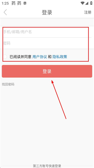 3、輸入手機(jī)/郵箱/用戶名和密碼,勾選協(xié)議點(diǎn)擊登錄即可。