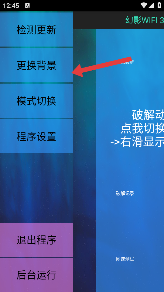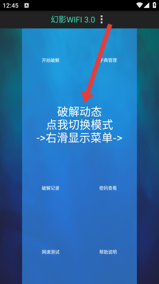 1、打開幻影WiFi APP,在主界面右滑顯示側(cè)邊菜單或點擊右上角功能按鈕調(diào)出菜單。