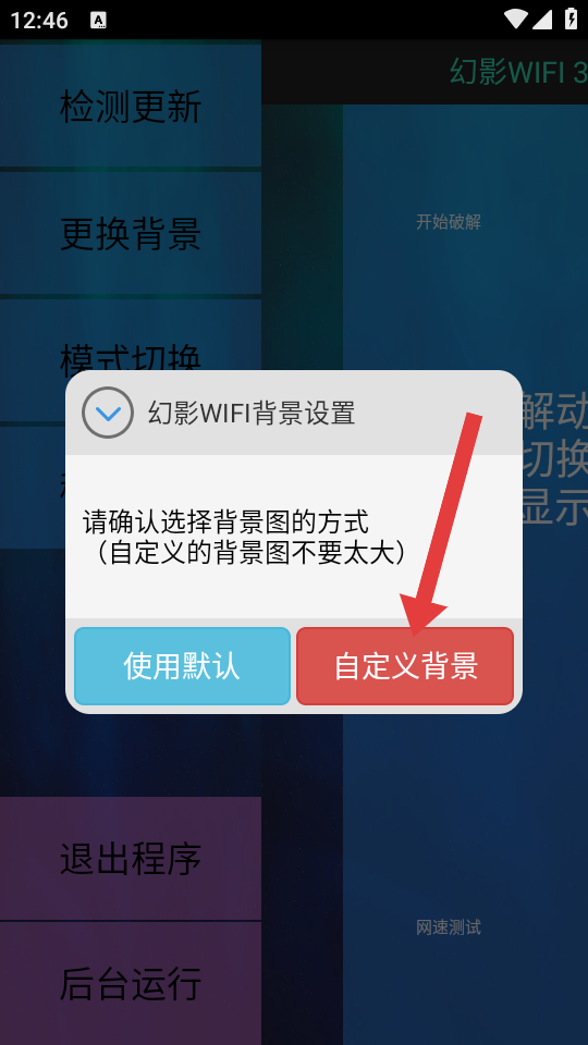 3、在幻影WiFi背景設置彈窗中,點擊自定義背景按鈕,進入本地照片選擇界面。