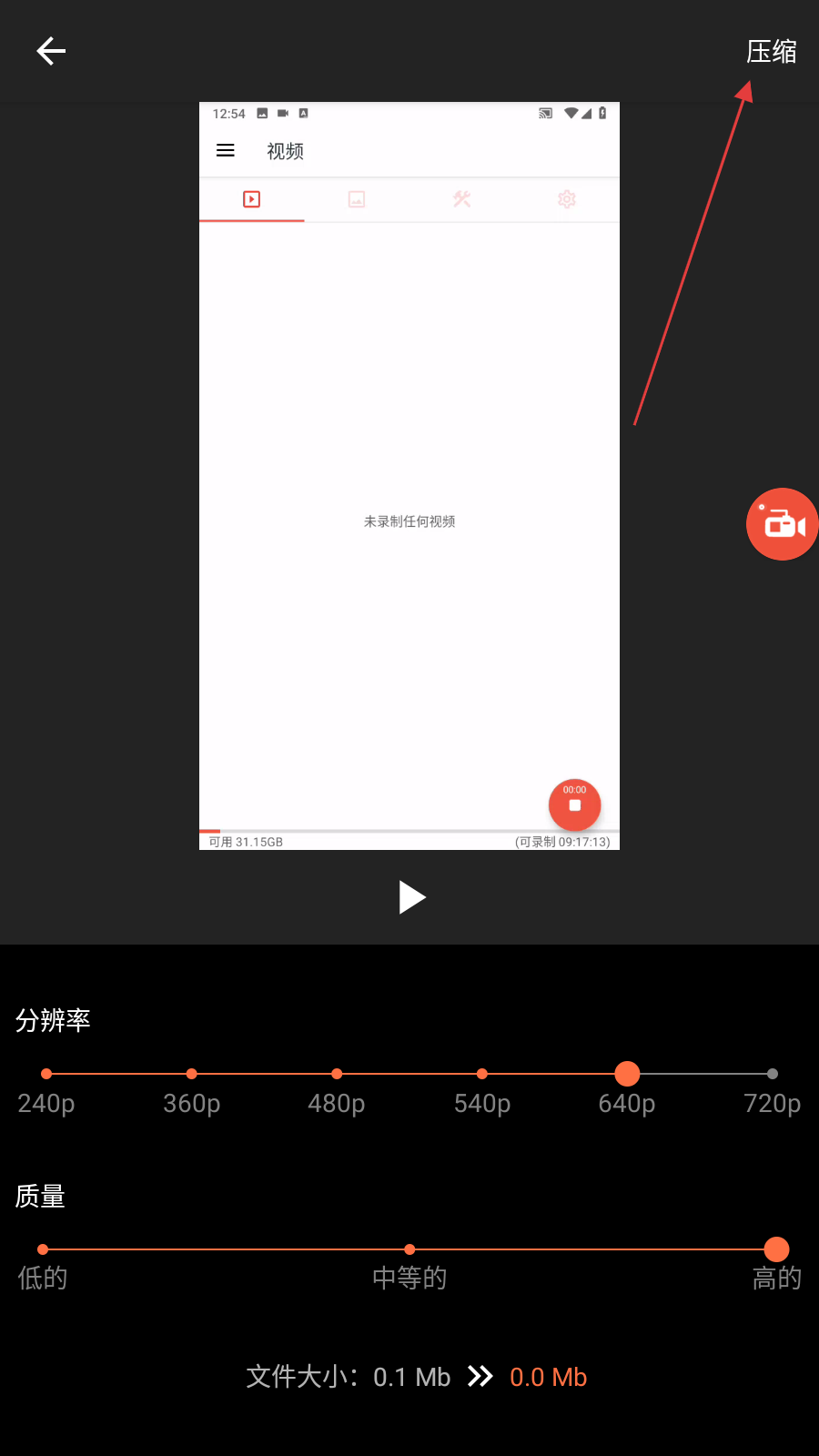 4、參數(shù)設置好后,點擊右上角的壓縮按鈕,等待壓縮完成,之后可在分享頁面選擇保存或分享壓縮后的視頻。