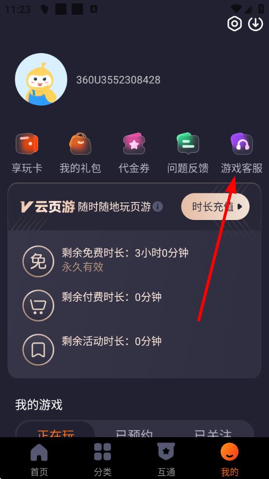2、在個人中心界面,找到并點擊游戲客服選項,進入360游戲客服中心。
