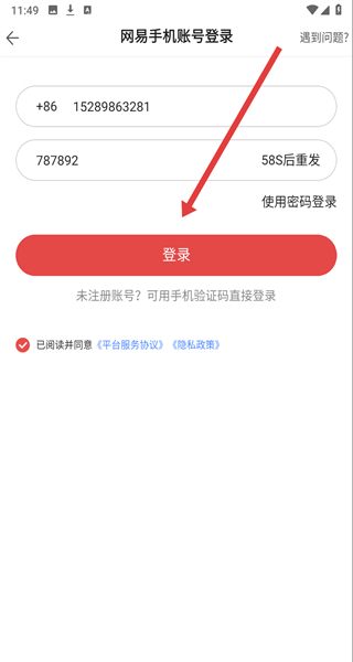 4、在手機(jī)賬號(hào)登錄頁(yè)面中,點(diǎn)擊輸入框填寫好手機(jī)號(hào)和驗(yàn)證碼信息后,即可點(diǎn)擊登錄按鈕完成登錄操作。