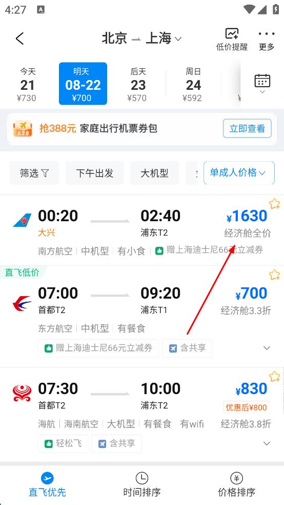 3、查詢結(jié)果展示后,瀏覽不同航班的起飛到達(dá)時間、價格、航空公司等詳情,點擊心儀航班對應(yīng)的區(qū)域,進(jìn)入該航班的訂單填寫與支付環(huán)節(jié) 。