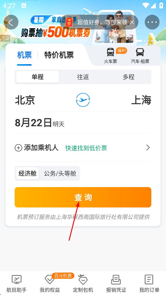 2、在機票預(yù)訂頁面,選擇行程類型(單程、往返等),填寫出發(fā)地、目的地、出行日期,添加乘機人,選定艙位后點擊“查詢”,獲取符合條件的航班信息。