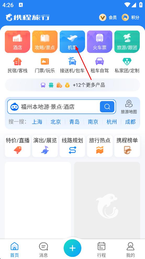 1、打開攜程旅行APP,進(jìn)入首頁后,點擊頂部“機票”圖標(biāo),切換至機票預(yù)訂專屬頁面,可在此進(jìn)行后續(xù)機票查詢操作。
