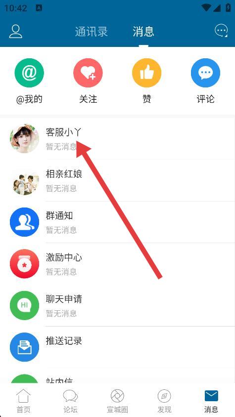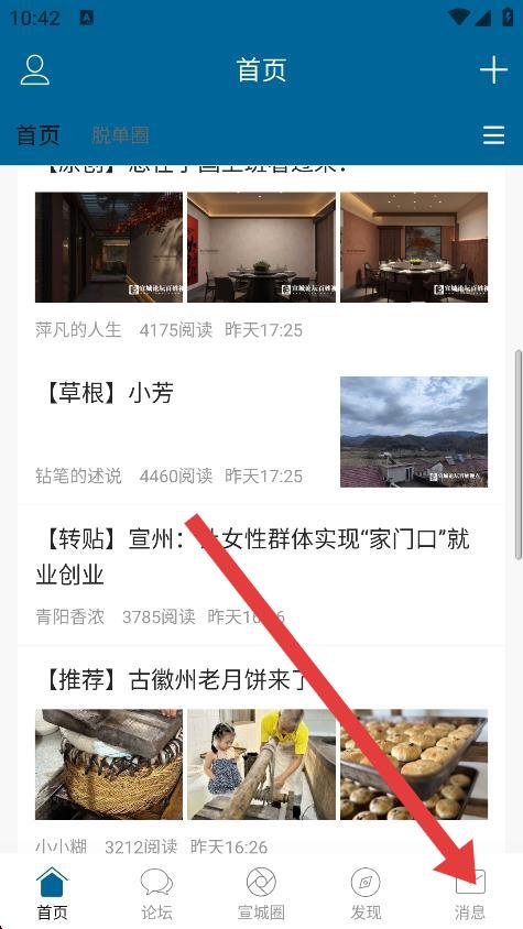 1、打開宣城論壇App,點擊底部導(dǎo)航欄中的消息選項。