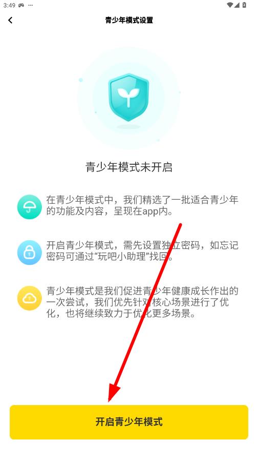 3、在青少年模式設置頁面,確認青少年模式未開啟后,點擊開啟青少年模式按鈕。