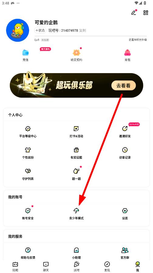 2、在個人頁面中,下滑找到青少年模式選項,點擊進入。