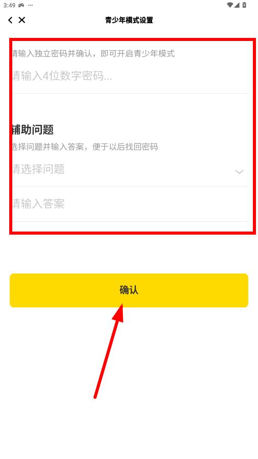 4、在新頁面中,輸入4位獨立密碼并確認,選擇輔助問題并輸入答案,點擊確認即可開啟青少年模式。