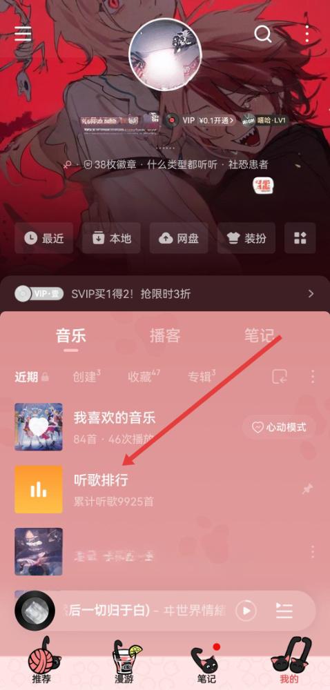 1、打開(kāi)網(wǎng)易云音樂(lè)APP,進(jìn)入我的頁(yè)面,找到聽(tīng)歌排行選項(xiàng),點(diǎn)擊進(jìn)入聽(tīng)歌排行頁(yè)面。