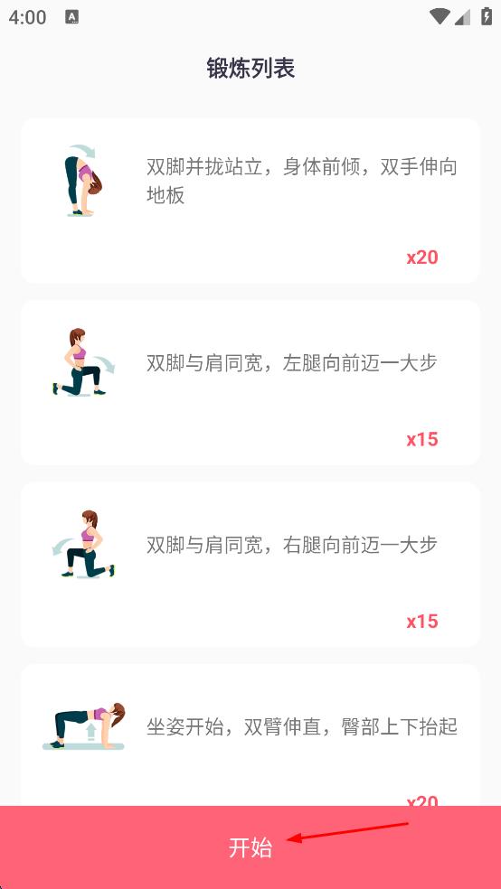 4、在鍛煉列表頁(yè)面查看鍛煉項(xiàng)目,點(diǎn)擊“開(kāi)始”,即可開(kāi)始第一天的運(yùn)動(dòng)鍛煉。