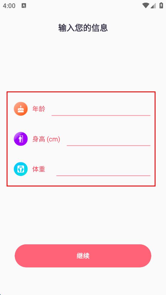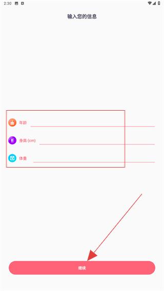 3、在輸入信息頁(yè)面依次輸入年齡、身高、體重,點(diǎn)擊繼續(xù),進(jìn)入鍛煉列表頁(yè)面。