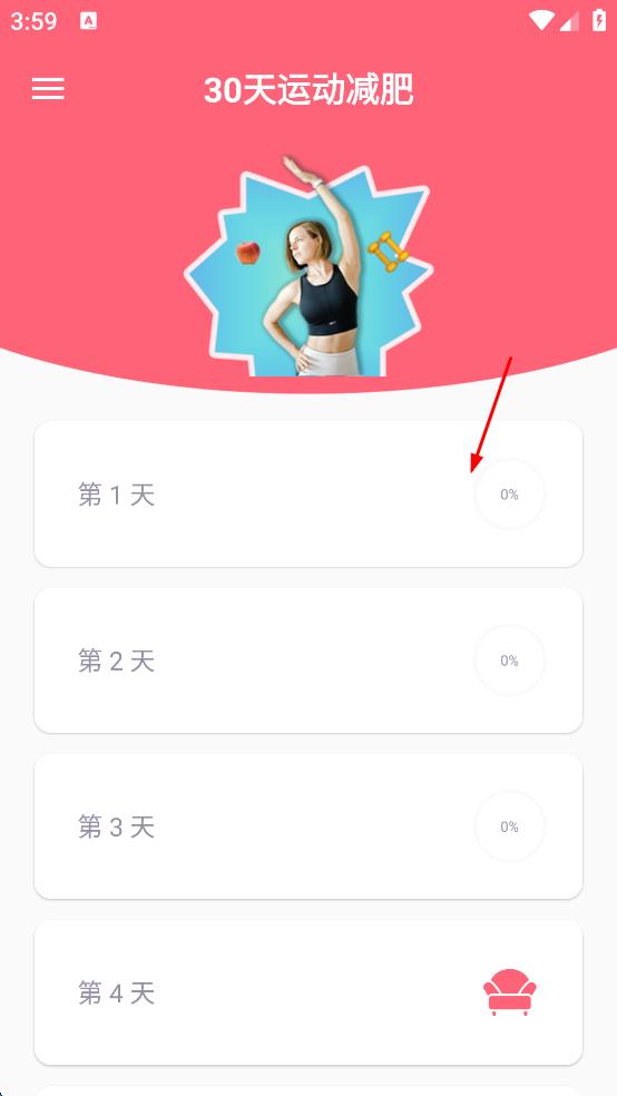 1、打開(kāi)運(yùn)動(dòng)減肥計(jì)劃APP,在首頁(yè)點(diǎn)擊第1天的按鈕。
