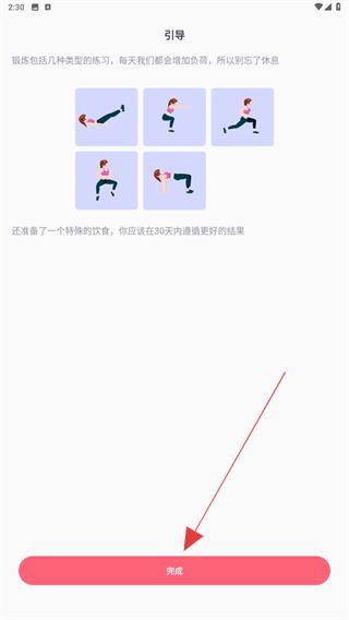 3、可根據(jù)圖片提示來(lái)進(jìn)行鍛煉,了解后點(diǎn)擊完成的按鈕。