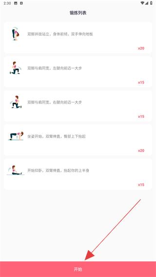 4、在鍛煉列表內(nèi),熟知后點(diǎn)擊下方開(kāi)始的按鈕即可。