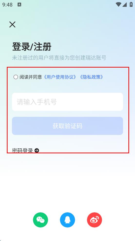 4、在登錄/注冊界面,先勾選“閱讀并同意用戶使用協(xié)議和隱私政策前的圓圈,然后在請輸入手機號,再點擊“獲取驗證碼”按鈕,后續(xù)輸入驗證碼等操作即可完成登錄。
