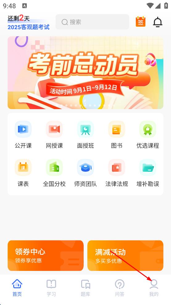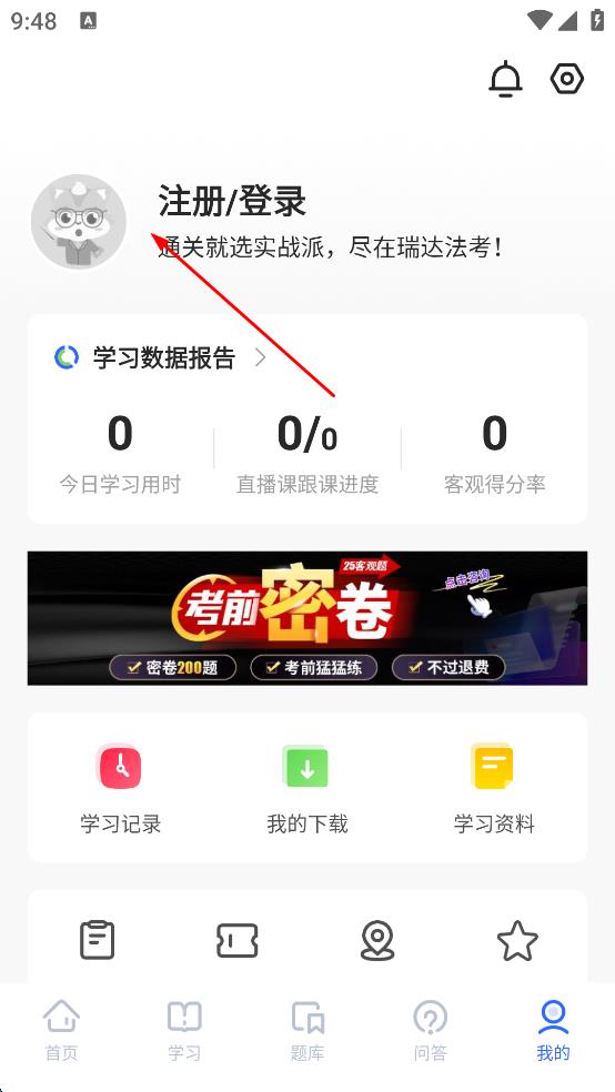 2、進入瑞達法考主界面后,在界面底部的導航欄中,找到“我的”選項并點擊,此時界面會切換到個人相關(guān)頁面。