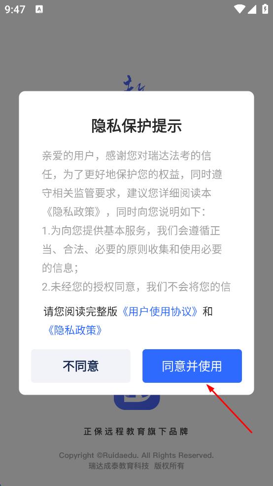 1、打開瑞達法考app,在彈出的隱私保護提示界面,找到“同意并使用”按鈕,點擊該按鈕。