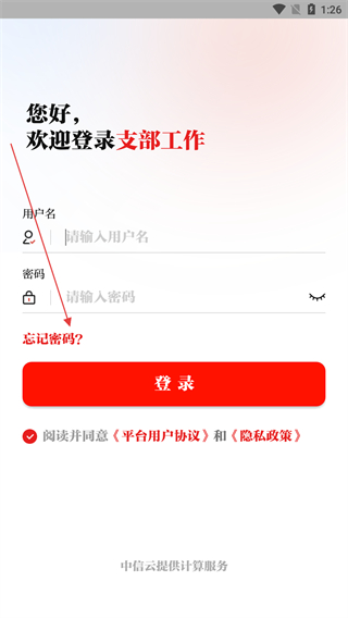 1、打開支部工作APP,在登錄頁面點擊忘記密碼選項。