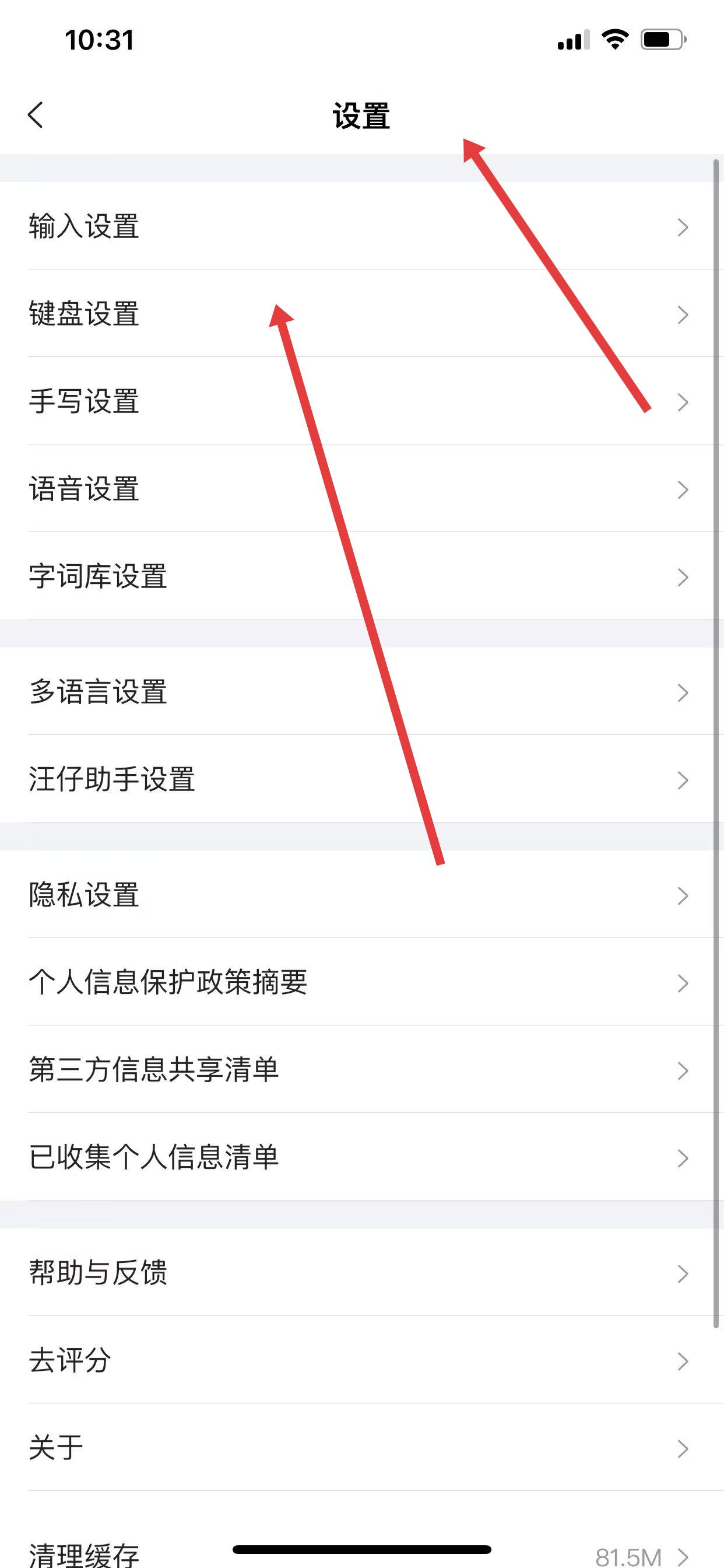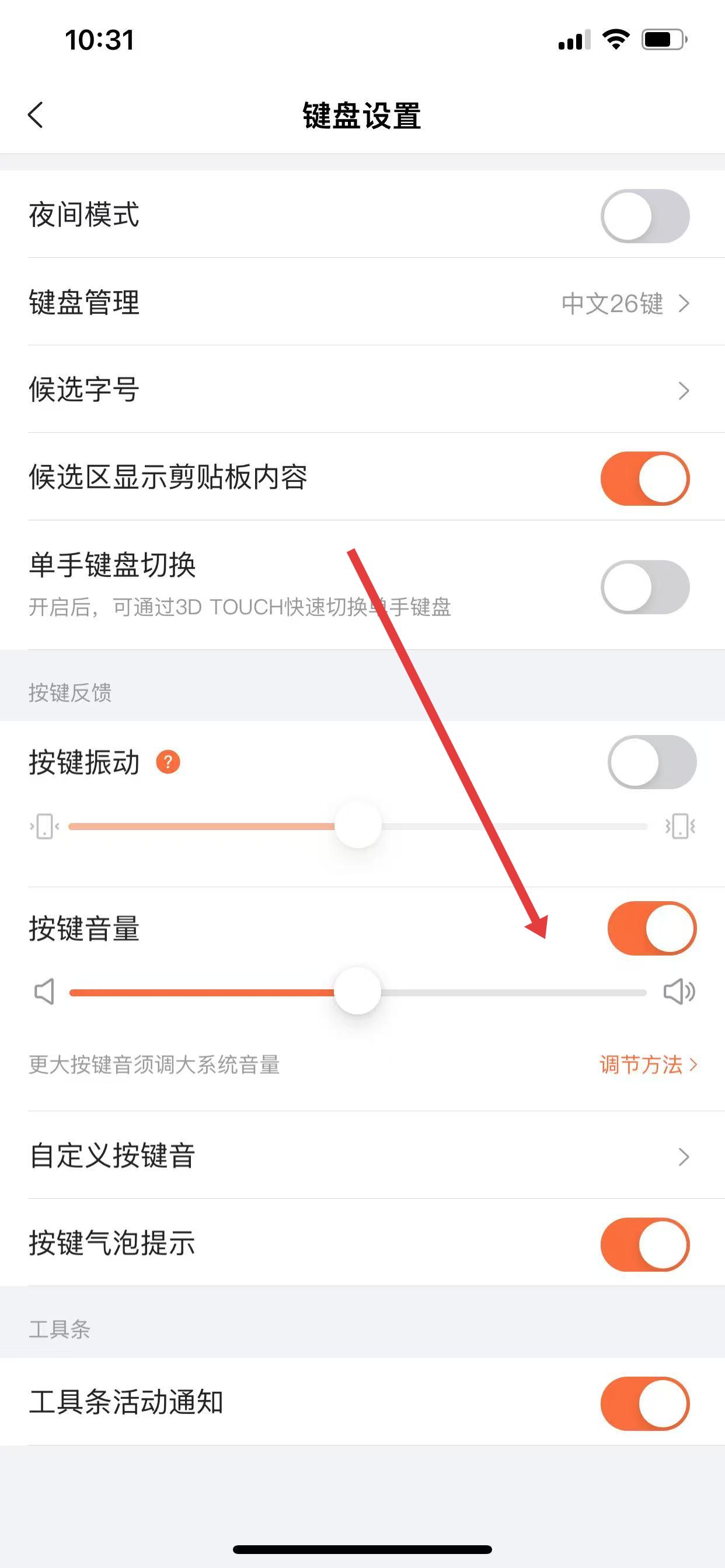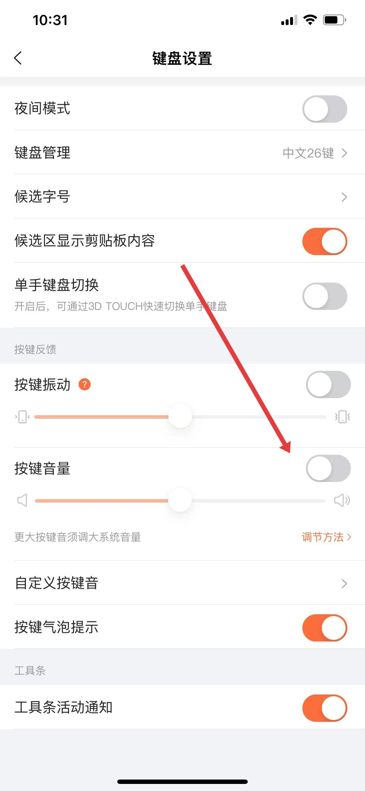 3、點(diǎn)擊按鍵音量右側(cè)開關(guān),關(guān)閉該功能,即可關(guān)閉打字聲音。