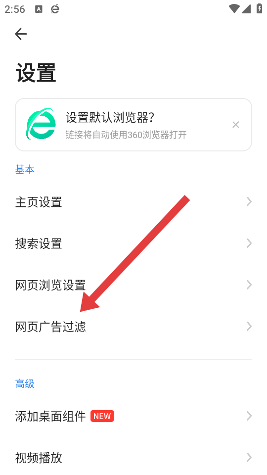 2、在設(shè)置頁面中,點(diǎn)擊網(wǎng)頁廣告過濾的選項(xiàng),進(jìn)入網(wǎng)頁廣告過濾設(shè)置的界面。
