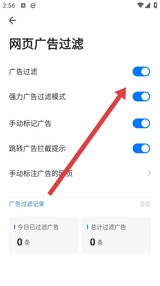 3、在網(wǎng)頁廣告過濾頁面里,按需開啟廣告過濾、強(qiáng)力廣告過濾模式等開關(guān),即可過濾網(wǎng)頁廣告。