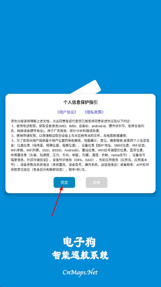 1、打開電子狗智能巡航系統(tǒng)APP,在個(gè)人信息保護(hù)指引頁面,閱讀《用戶協(xié)議》《隱私政策》后,點(diǎn)擊“同意”,進(jìn)入應(yīng)用主界面 。