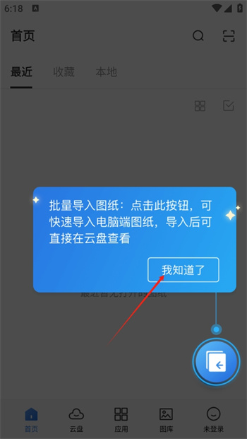 1、來到應(yīng)用之后會有一個使用的提示窗口,提示你點擊這里,就可以快速的進行各種圖紙查看任務(wù)了,滿足不同格式之間的查看,輕松實現(xiàn)各種二維或者是三維圖紙查看;