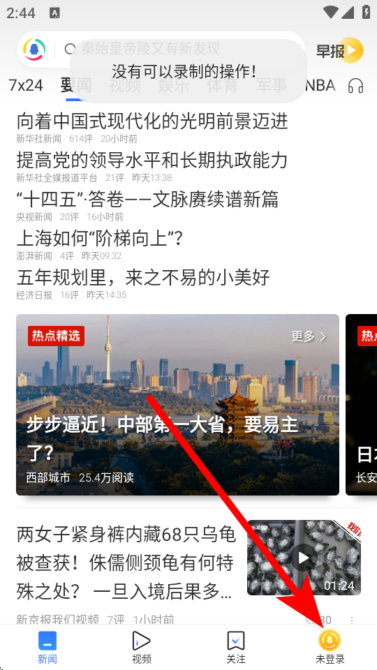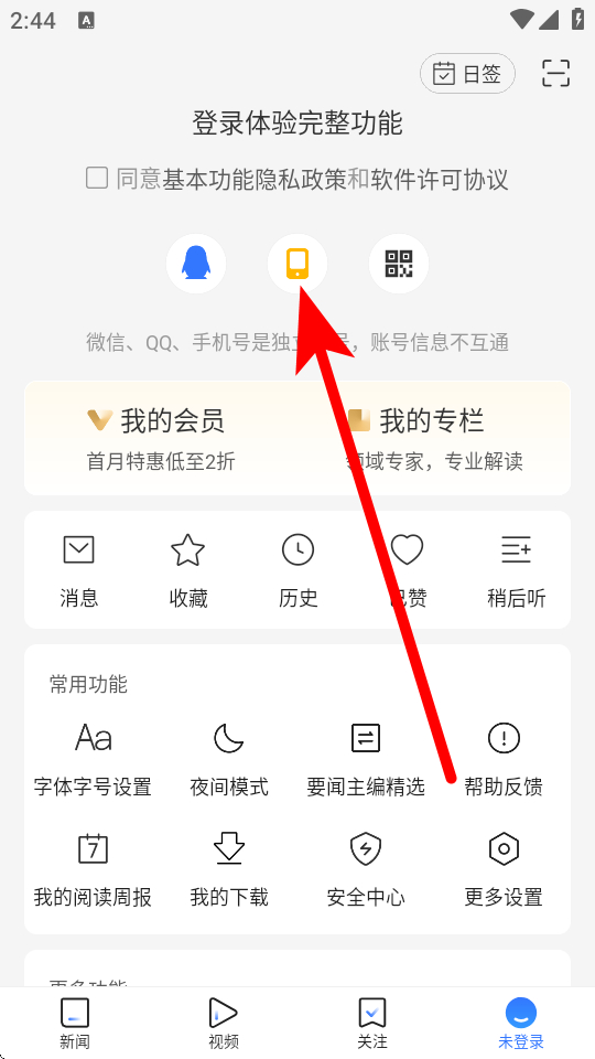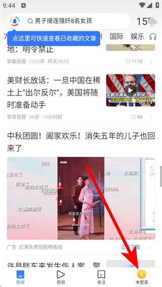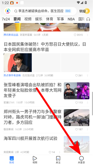 1、在騰訊新聞首頁,點擊右下角未登錄選項,進入登錄頁面。