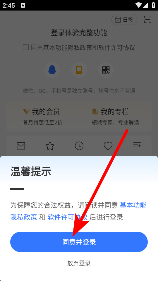 3、在溫馨提示框中,點擊同意并登錄按鈕,進入手機號輸入界面。
