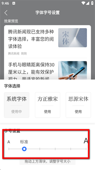 3、在字體字號設(shè)置頁面,找到字號設(shè)置區(qū)域,拖動滑塊調(diào)整大小即可。