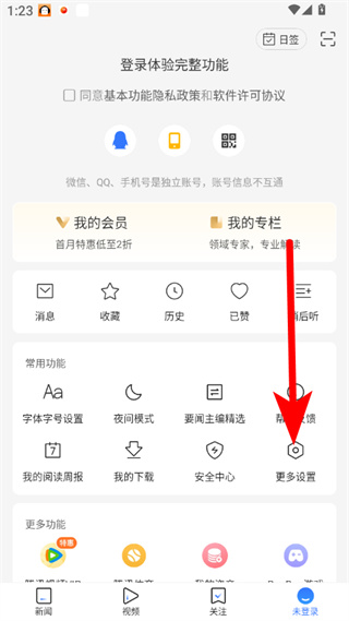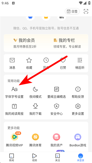 1、在騰訊新聞首頁,點擊右下角未登錄選項,進入個人功能頁面。
