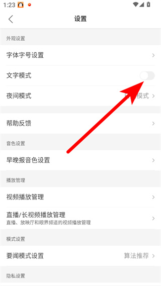4、在設(shè)置頁面,點擊文字模式的開啟按鈕,即可開啟文字模式。