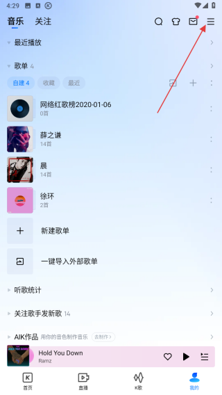 1、打開酷狗音樂APP,點擊我的頁面右上角三條橫線的菜單圖標(biāo)。