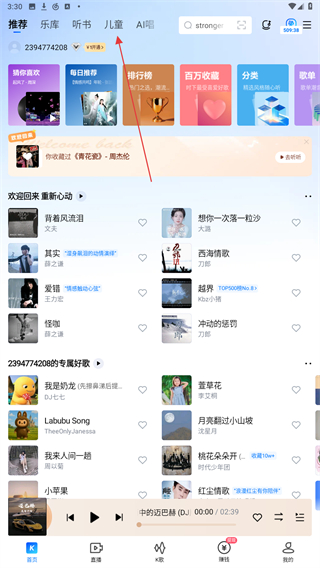 1、打開酷狗APP,在首頁上點擊兒童的標(biāo)簽。