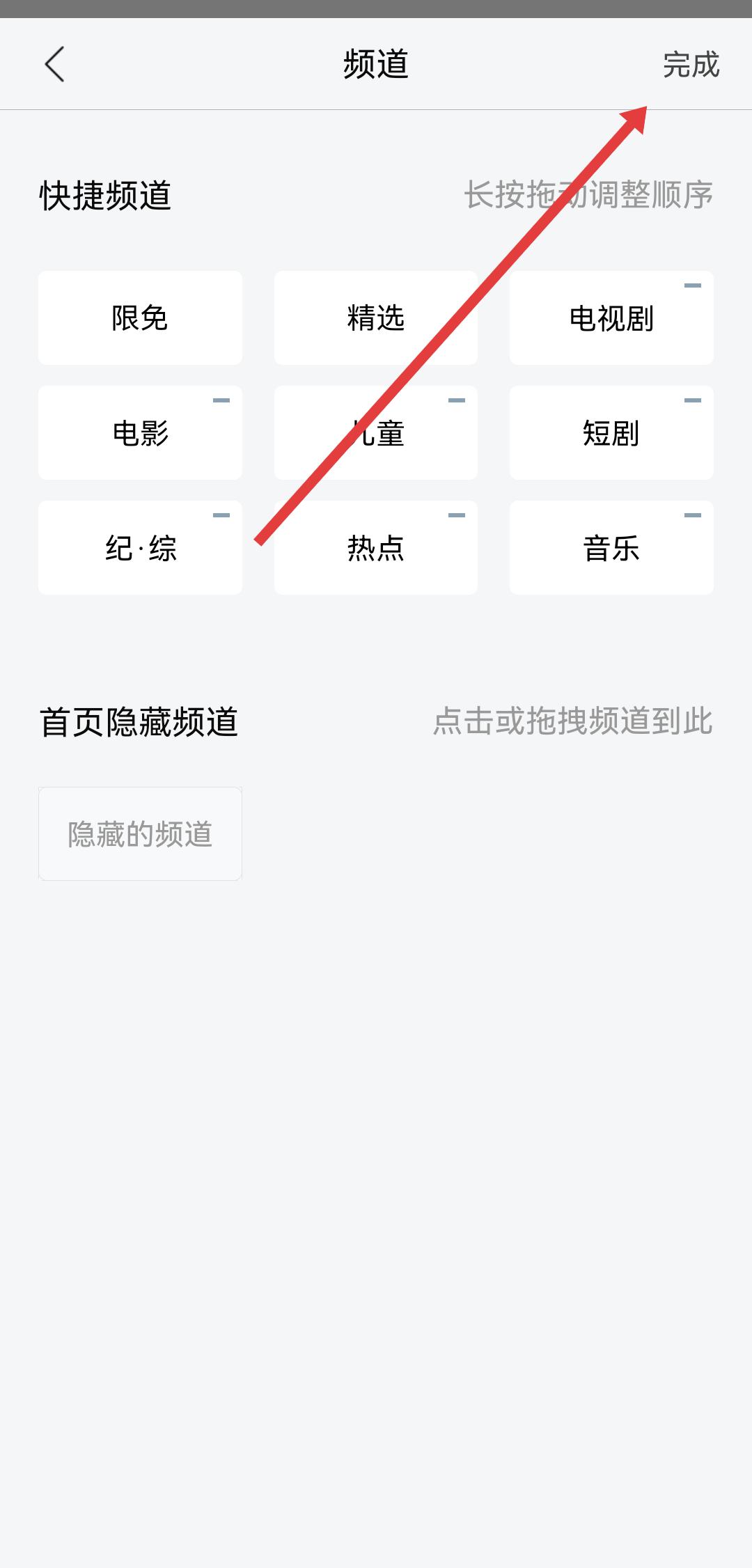 3、根據(jù)自己的觀看習慣,完成頻道的順序調(diào)整或隱藏設置后,點擊頁面右上角的完成按鈕,保存編輯操作。