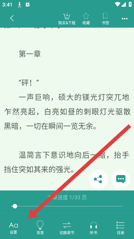 1、在晉江小說閱讀的界面,點(diǎn)擊頁面中間呼出功能欄,選擇左下角的設(shè)置,進(jìn)入閱讀設(shè)置入口。