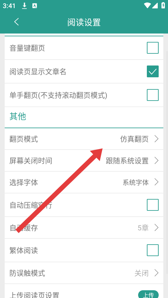 3、進(jìn)入閱讀設(shè)置頁面后,找到翻頁模式的選項(xiàng),可按需選擇仿真翻頁等模式,完成翻頁方式的自定義設(shè)置。