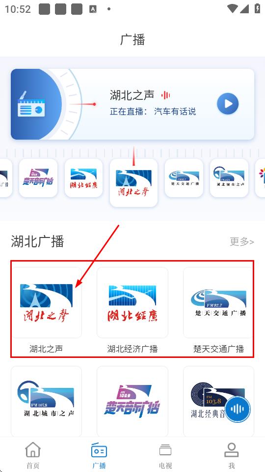 2、在廣播頁面,選擇想要回聽節(jié)目的對(duì)應(yīng)電臺(tái),如湖北之聲。