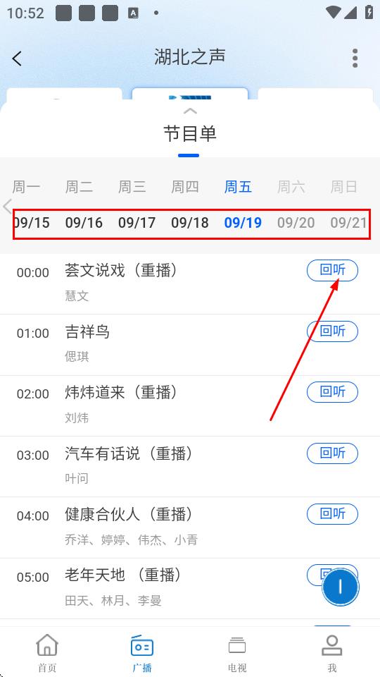 3、進(jìn)入電臺(tái)頁面后,選擇節(jié)目日期,并點(diǎn)擊想要回聽節(jié)目右側(cè)的回聽按鈕。