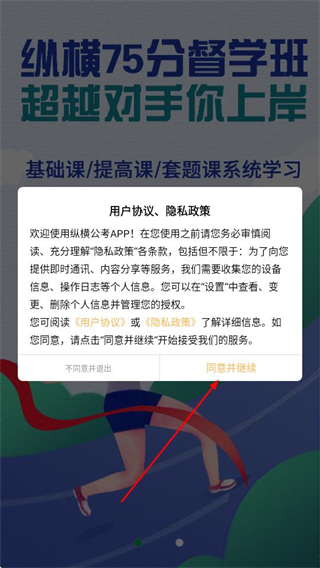 1、打開縱橫公考APP,在彈出的用戶協(xié)議、隱私政策界面,點擊同意并繼續(xù)。