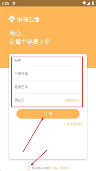 3、在注冊界面,依次填寫昵稱、手機號碼、登錄密碼,勾選登錄即表示同意用戶協(xié)議、隱私政策。