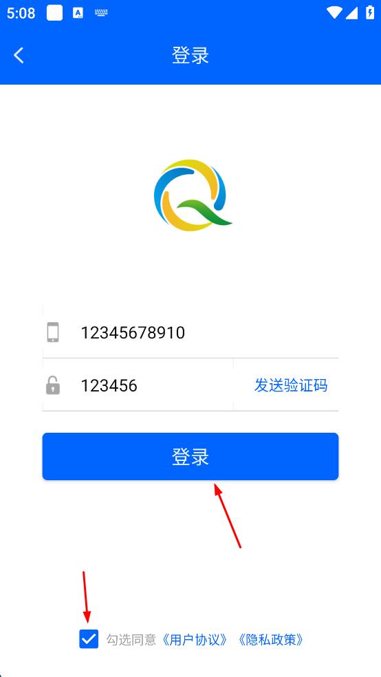 4、勾選勾選同意用戶協(xié)議,隱私政策,然后點(diǎn)擊“登錄”按鈕。
