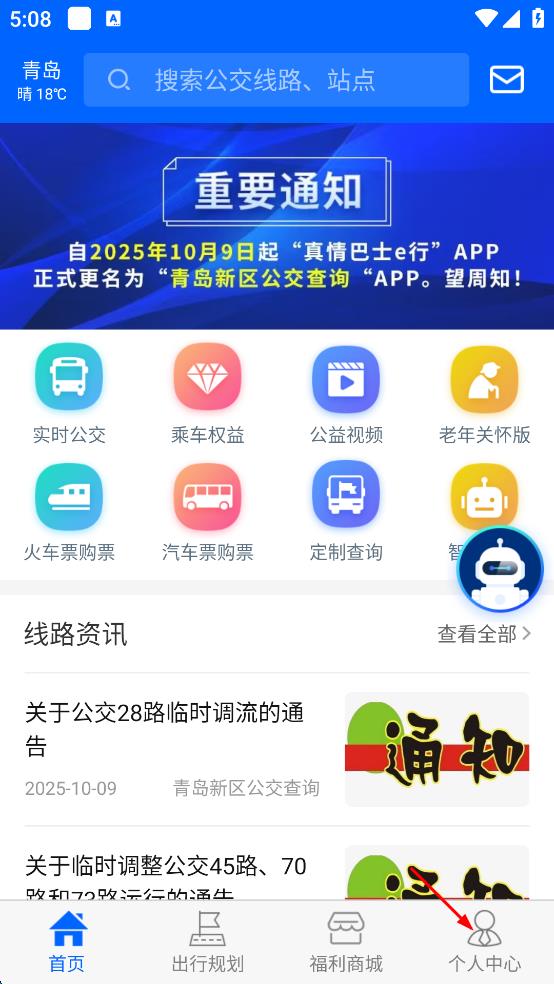1、打開公交查詢APP,進(jìn)入首頁后,點(diǎn)擊頁面右下角“個(gè)人中心”選項(xiàng)。