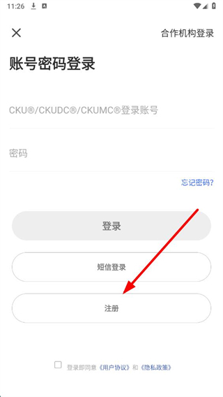 3、在登錄注冊(cè)頁(yè)面,點(diǎn)擊注冊(cè)選項(xiàng),進(jìn)入手機(jī)號(hào)登錄注冊(cè)頁(yè)面。