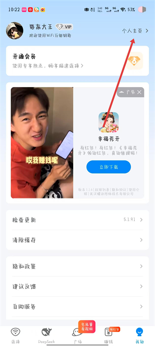 1、打開WiFi萬能鑰匙進(jìn)入我的界面,點(diǎn)擊個(gè)人主頁選項(xiàng)。