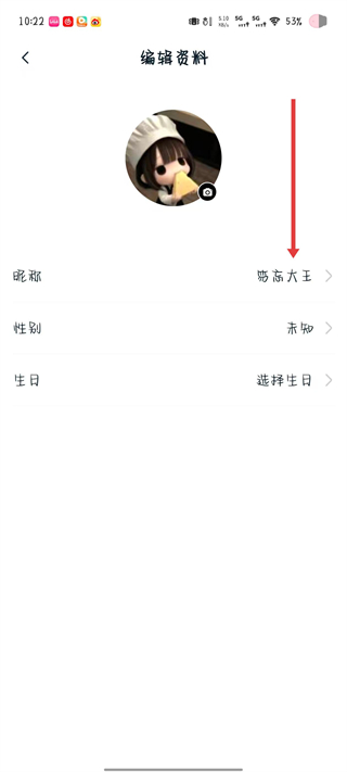 3、在編輯資料界面點(diǎn)擊昵稱選項(xiàng),進(jìn)入編輯名字的頁面。
