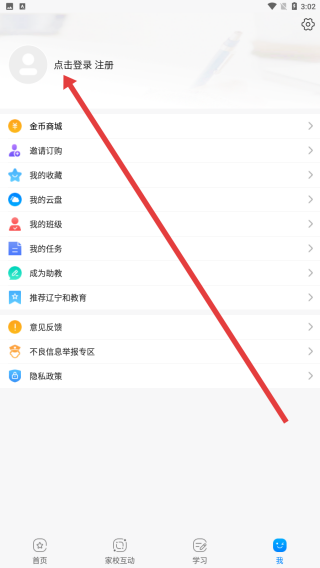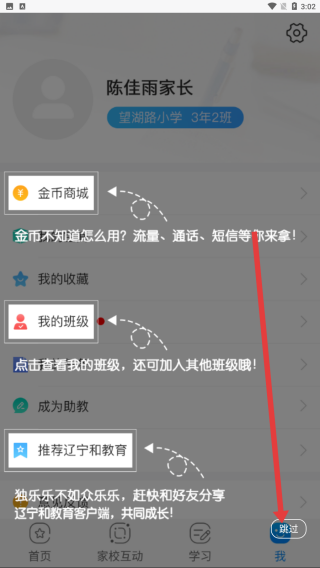 1、在遼寧和教育APP的我界面,點(diǎn)擊右下角跳過按鈕,跳過功能使用指導(dǎo),進(jìn)入下一級頁面繼續(xù)操作。